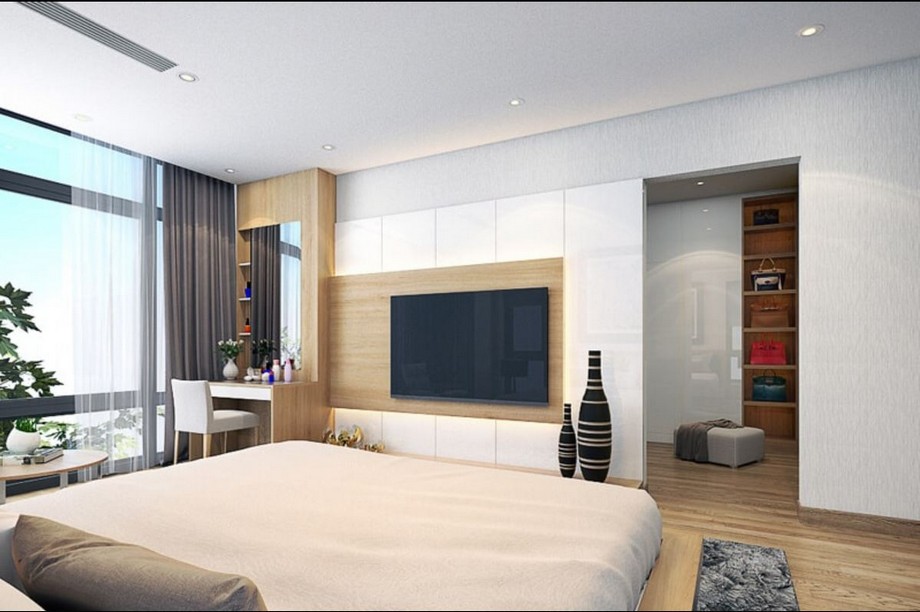 Mẫu phòng ngủ kết hợp với tivi và phòng thay đồ